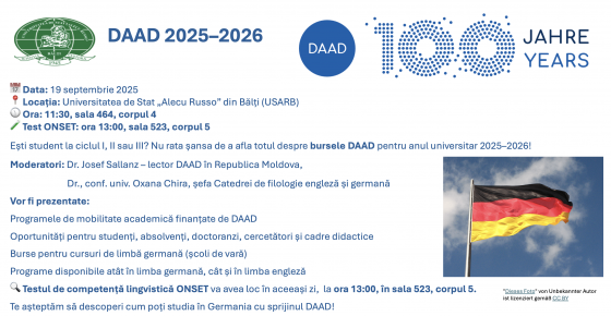 Prezentarea burselor DAAD la Universitatea de Stat „Alecu Russo” din Bălți În data de 19 septembrie 2025, Universitatea de Stat „Alecu Russo” din Bălți (USARB) a găzduit prezentarea programelor de burse oferite de Serviciul German de Schimb Academic (DAAD), adresate studenților, masteranzilor, doctoranzilor și cadrelor didactice universitare din diverse domenii Evenimentul a fost susținut de…