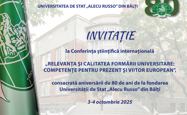 Read MoreConferința științifică internațională ,,Relevanţa şi calitatea formării universitare: competenţe pentru prezent şi viitor european” Universitatea de Stat „Alecu Russo” din Bălţi organizează în data de 3 – 4 octombrie 2025, Conferința științifică internațională ,,Relevanţa şi calitatea formării universitare: competenţe pentru prezent şi viitor european”, consacrată aniversării de 80 de ani de la fondarea Universităţii de…
